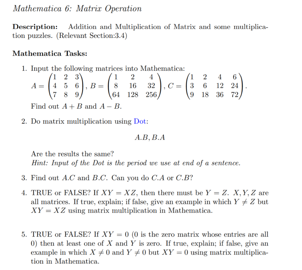 Mathematica 6 Matrix Operation Please Solve Chegg Com